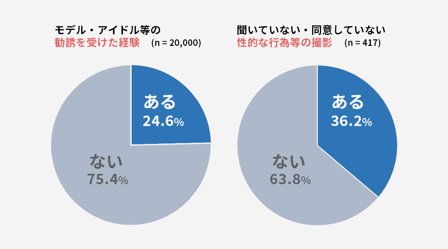 2020年に全国の15歳(中学生を除く。)から39歳までの女性2万人を対象に行われた調査では、街中でスカウトやSNSを通じて、「モデルやアイドル等になりませんか」、「オーディションを受けませんか」、「雑誌・テレビ番組等の撮影に協力してほしい」などと誘われたり、「安全・安心の高収入アルバイト」といった勧誘を受けたことがある人の割合は24.6%でした。